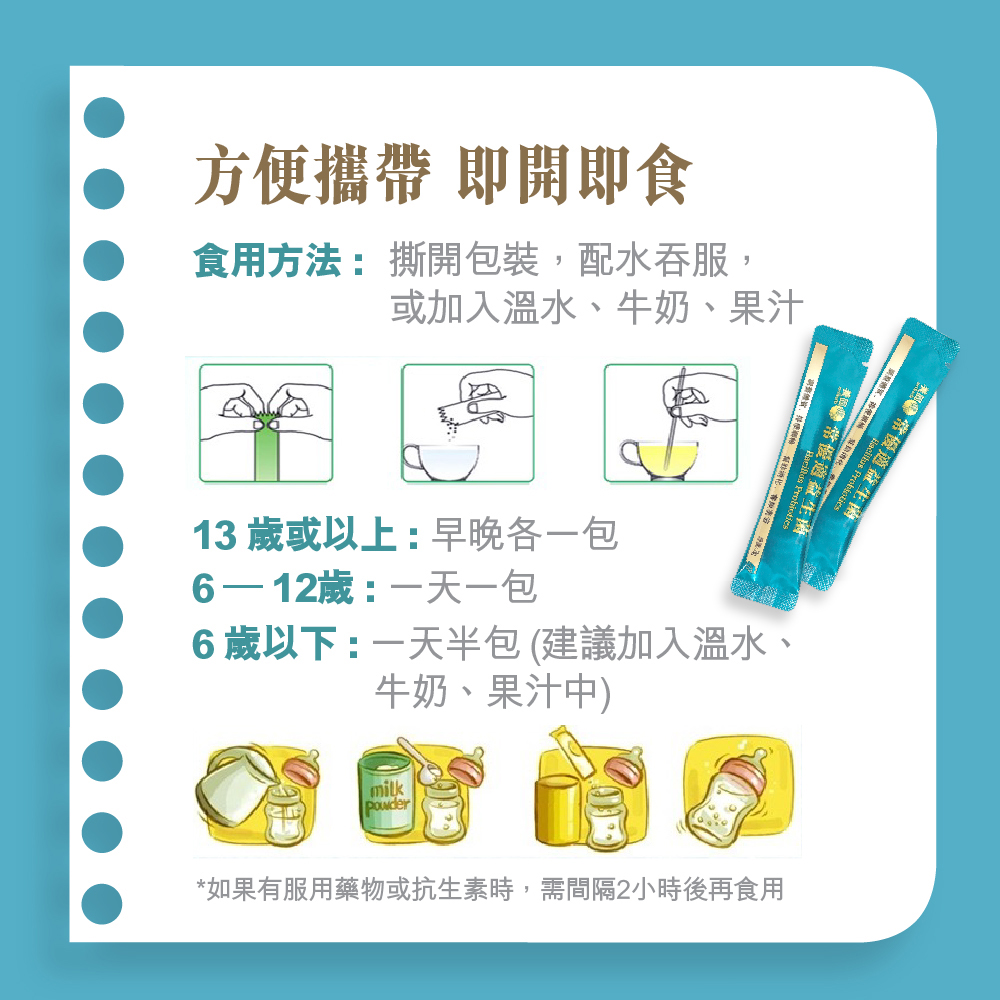 13歲以上: 早晚各一包6-12歲 : 一天一包6歲以下 : 一天半包(建議加入溫水, 牛奶, 果汁中)※本產品含有牛奶製品及大豆製品,不適合對其過敏體質者食用。