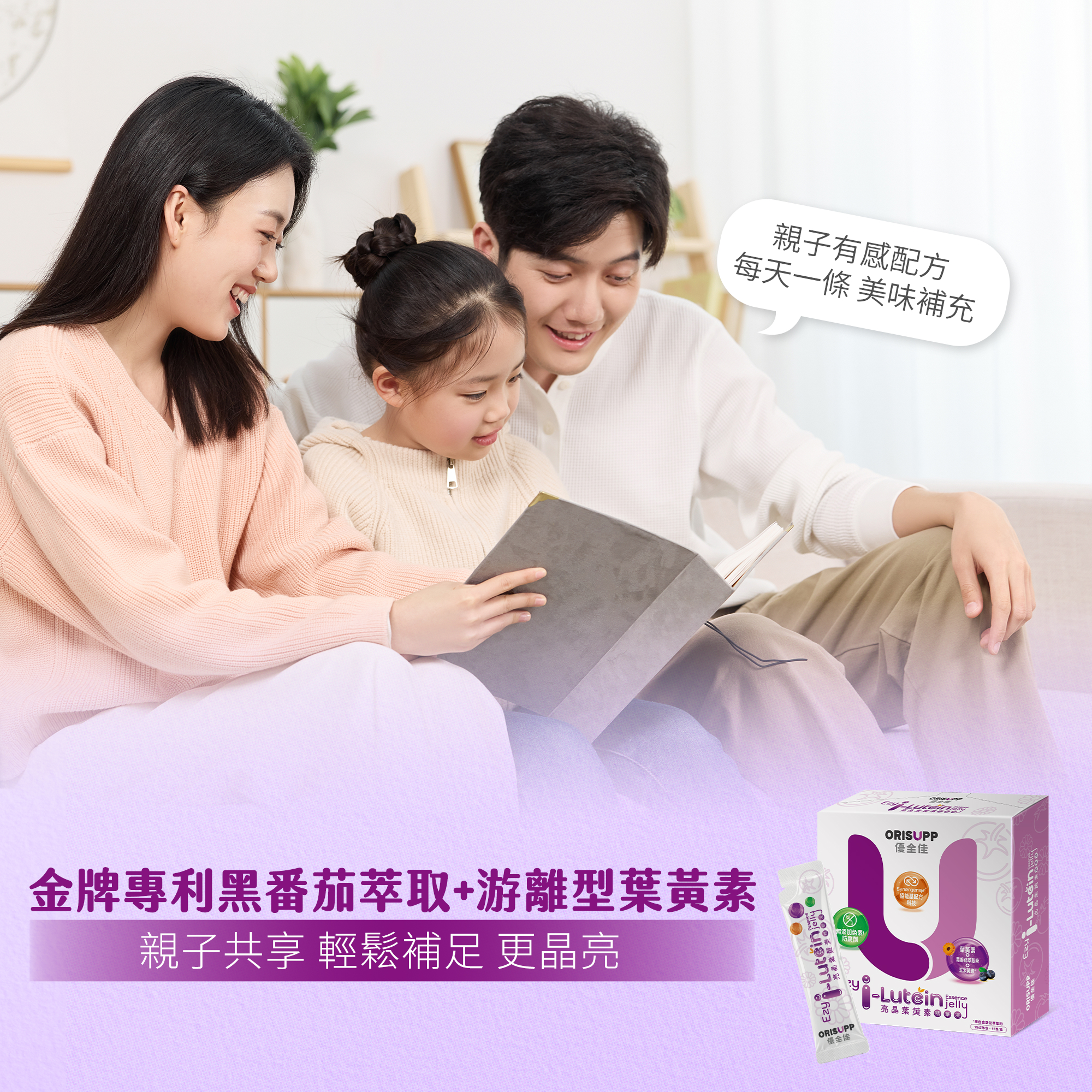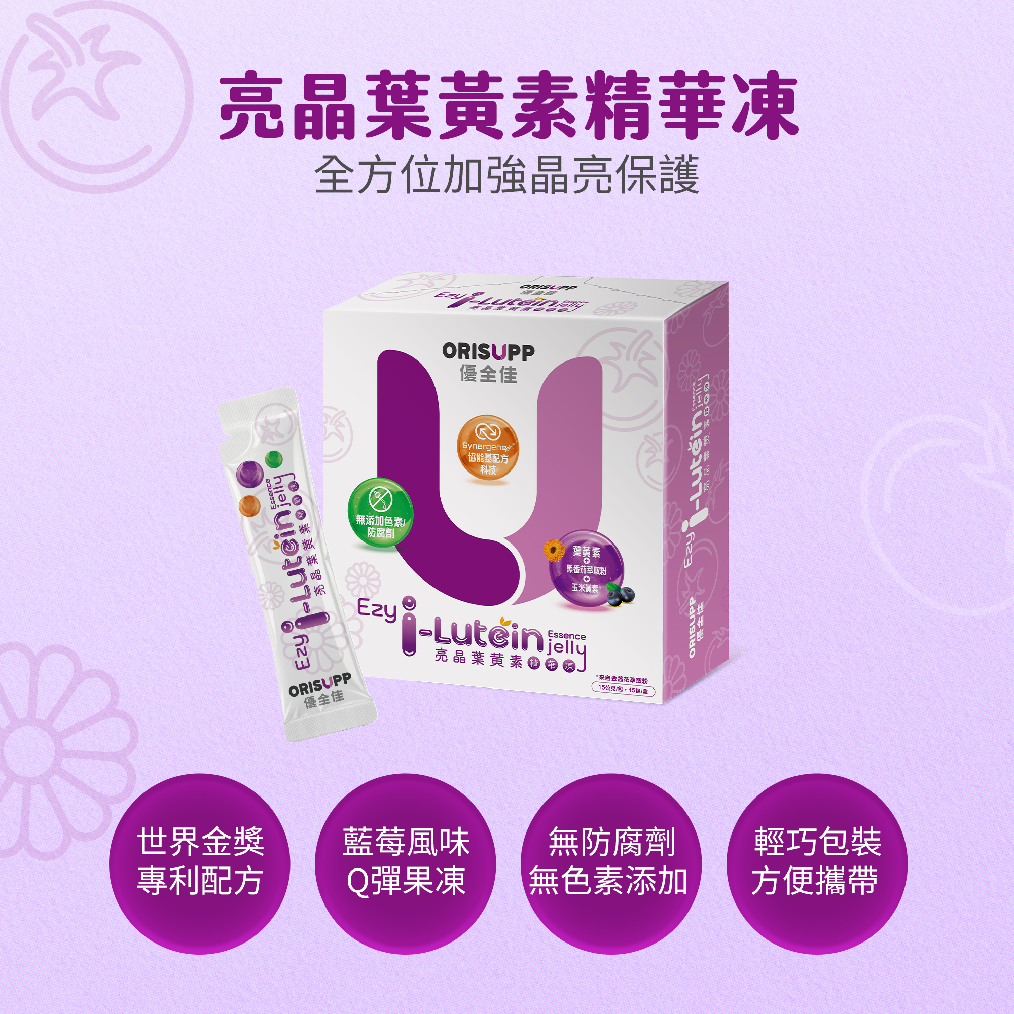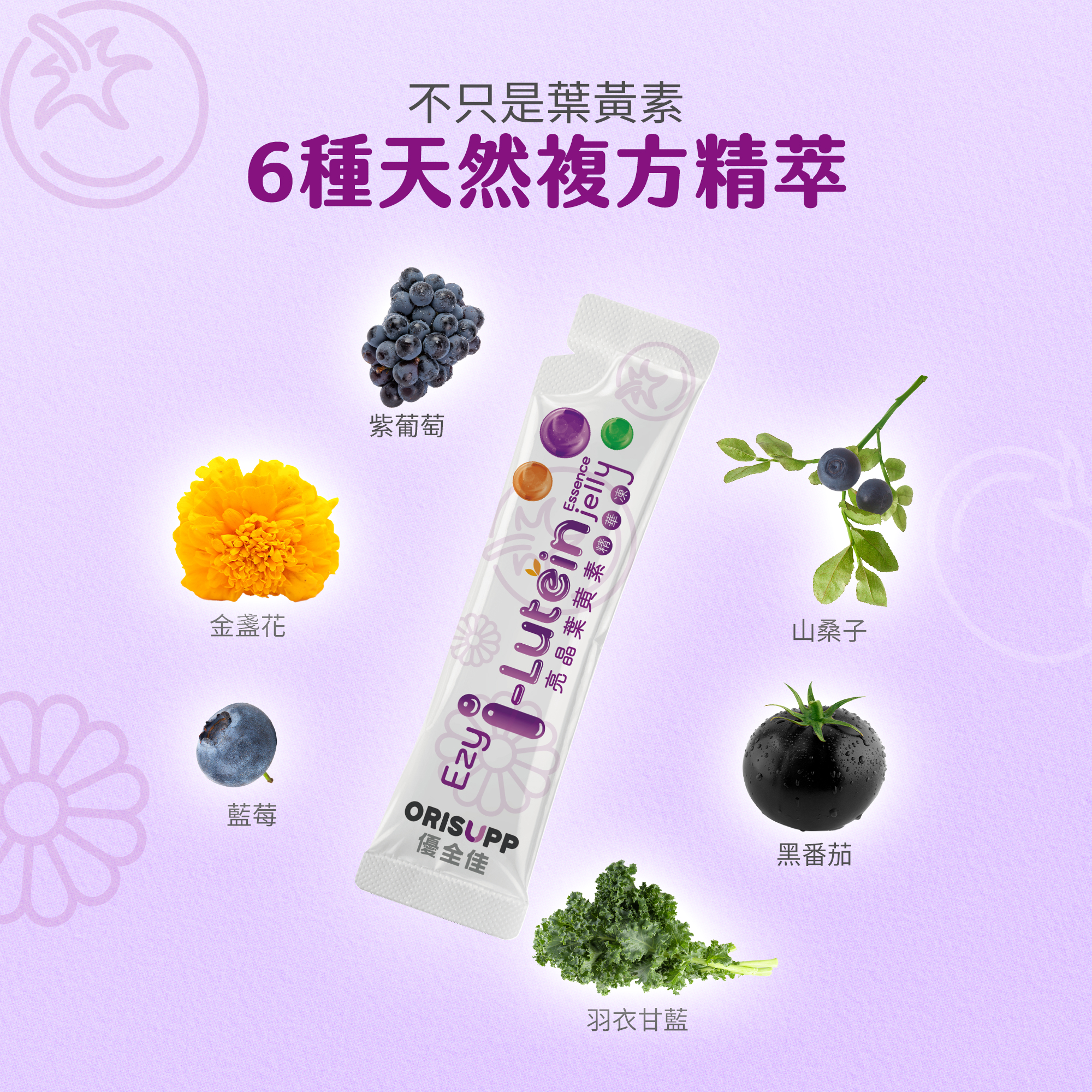 水 , 赤藻醣醇(保濕劑), 黑番茄萃取粉(麥芽糊精,檸檬酸,黑番茄萃取物 , 檸檬酸鈉(酸度調節劑), 蒟蒻粉(增稠劑), 鹿角菜膠(增稠劑),葉黃素粉(辛烯基丁二酸鈉澱粉,固態葡萄糖漿,蔗糖,葉黃素,抗氧化劑(維生素C),水)氯化鉀(增味劑), 藍莓濃縮汁 , 刺槐豆膠(增稠劑), 乳酸鈣(固化劑), 檸檬酸(酸度調節器), 玉米糖膠(增稠劑), 紅葡萄濃縮汁 , 蔓越莓香料 , 藍莓香料 , 羽衣甘藍汁粉(羽衣甘藍,麥芽糊精),蘋果濃縮果汁 , 蔗糖素(甜味劑), 山桑子萃取粉(山桑子萃取物,麥芽糊精)複合紫蘿蔔濃縮汁(紫蘿蔔濃縮汁,檸檬濃縮汁), 金盞花萃取粉(含玉米黃素)(麥芽糊精,金盞花萃取物), 胡椒鹼