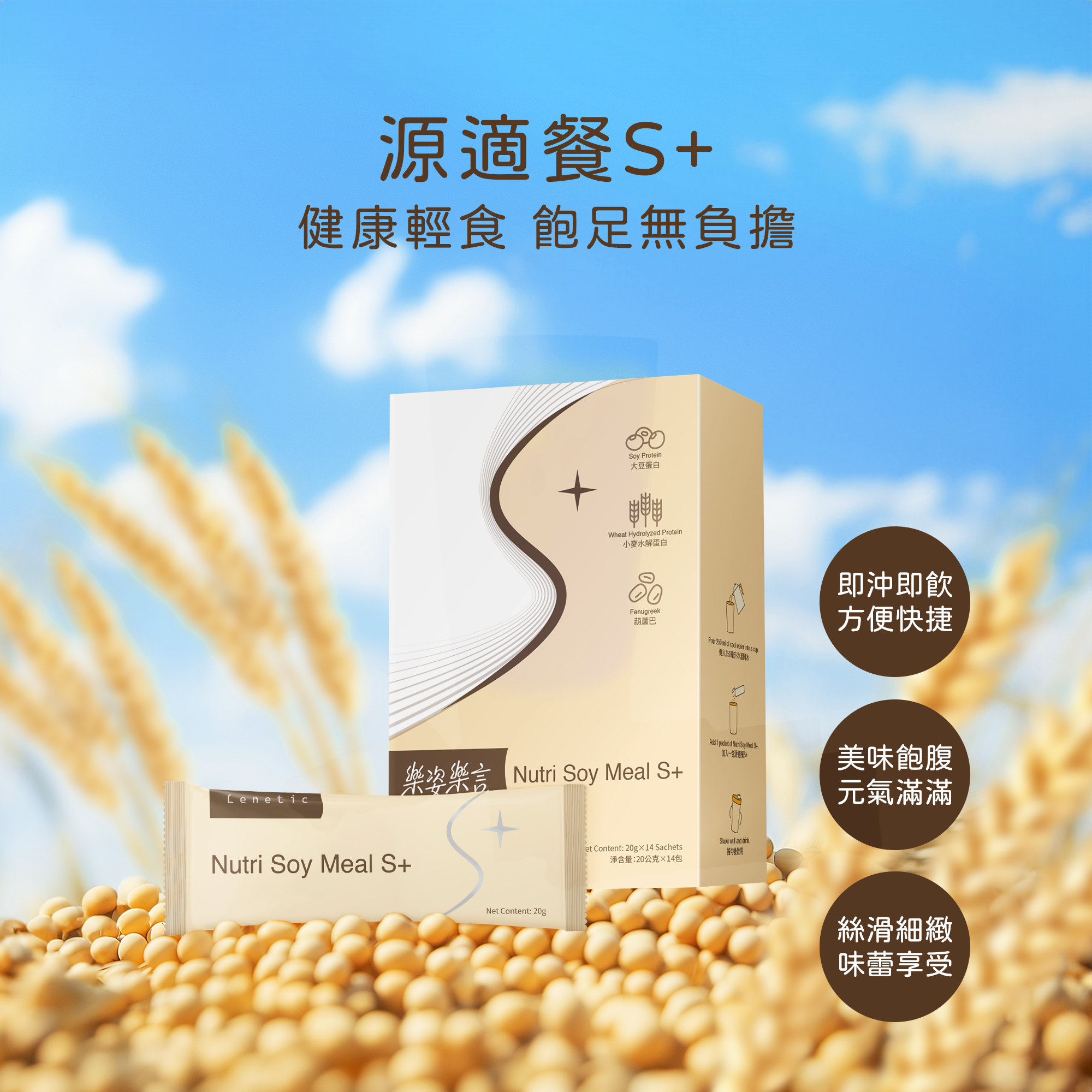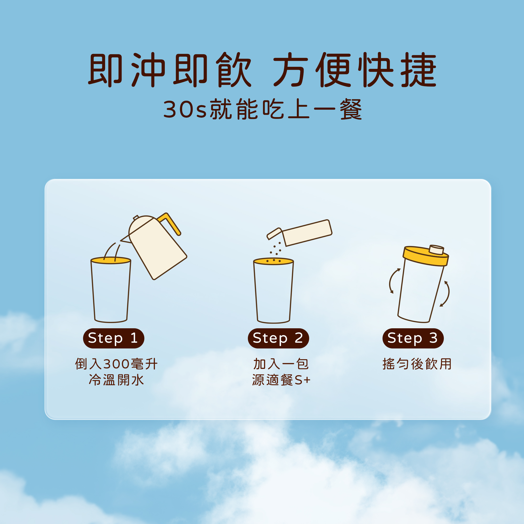 使用方法: 使用300毫升冷溫開水,加入一包源適餐S+ ,充分搖勻即可飲用。