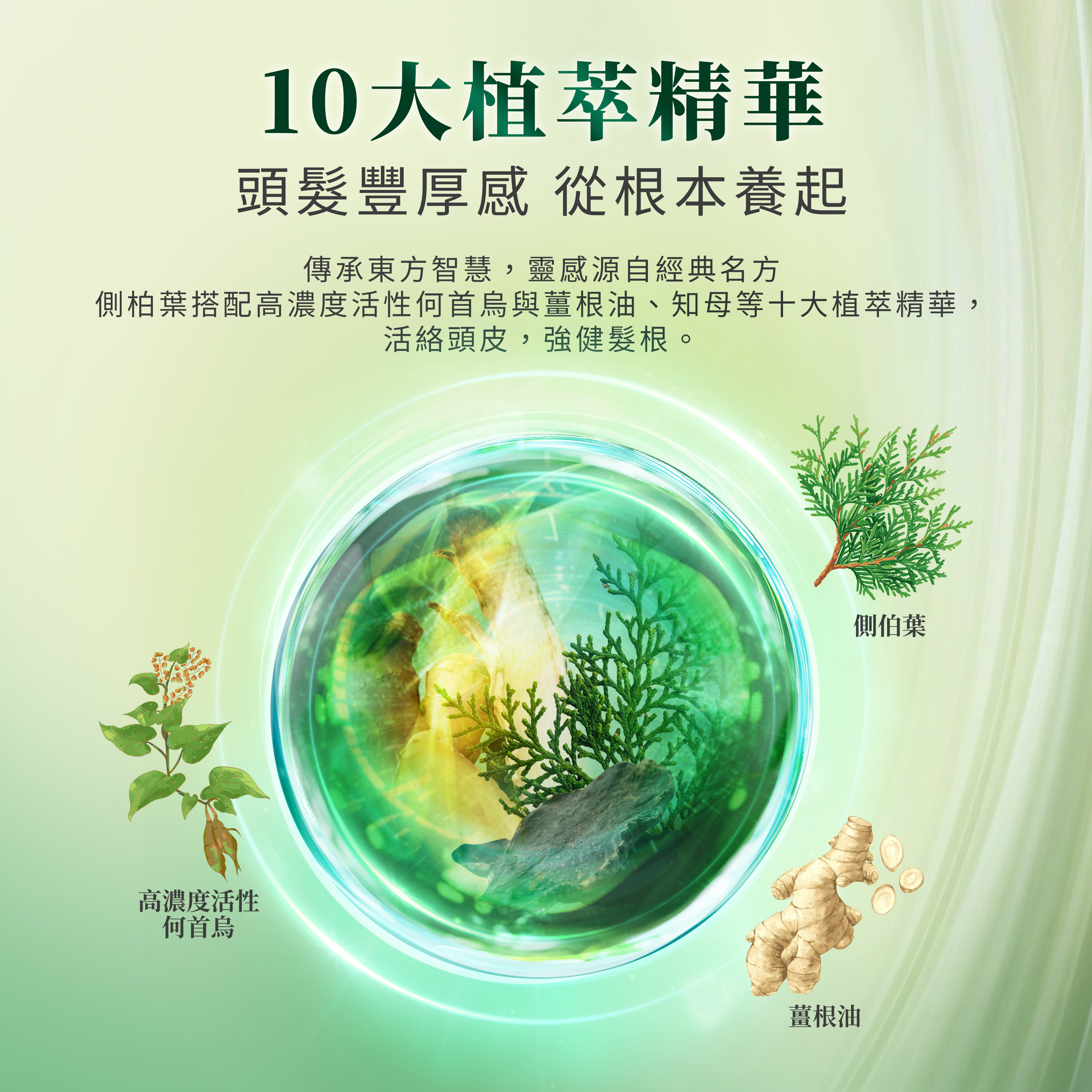 側柏葉、知母、何首烏、苦參、防風根、地黃根、亞麻籽、黃檗樹、鱧腸、薑根油